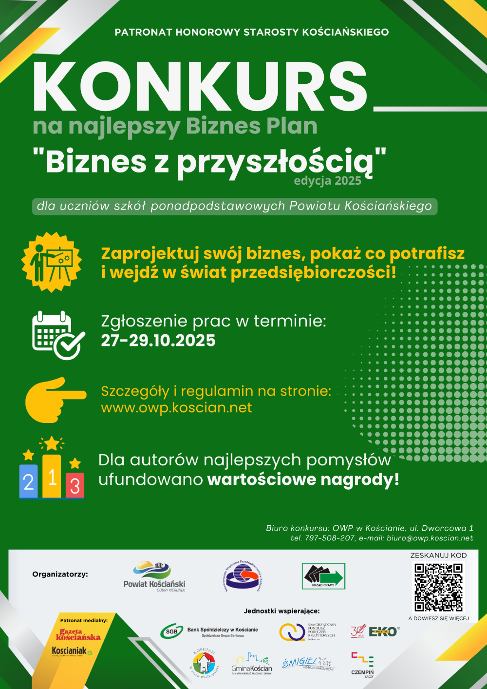 Startuje ósma edycja konkursu na najlepszy Biznes Plan „Biznes z przyszłością” 2025! Jeśli jesteś uczniem jednej ze szkół ponadpodstawowych w powiecie kościańskim, masz głowę pełną pomysłów i chcesz spróbować swoich sił w biznesie – ten konkurs jest dla Ciebie!