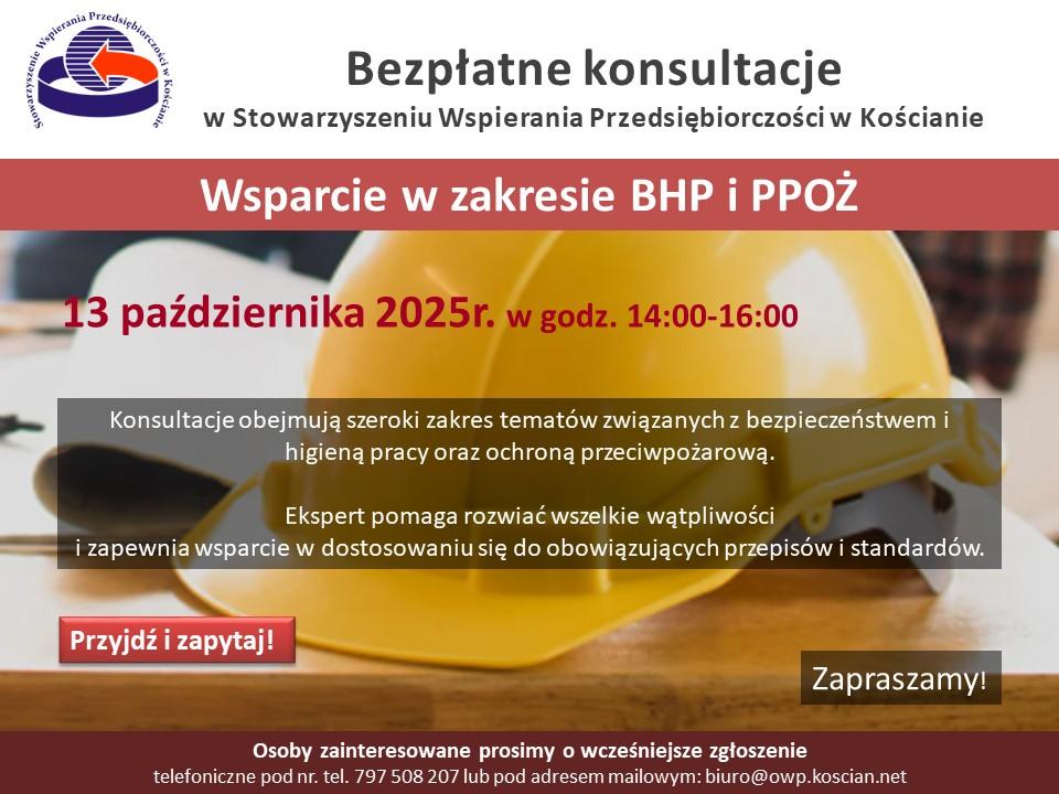 Przedsiębiorcy oraz osoby planujące założenie działalności gospodarczej mogą skorzystać z bezpłatnych konsultacji w zakresie Bezpieczeństwa i Higieny Pracy (BHP).